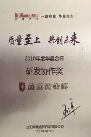 2010年度华晨金杯研发协作奖